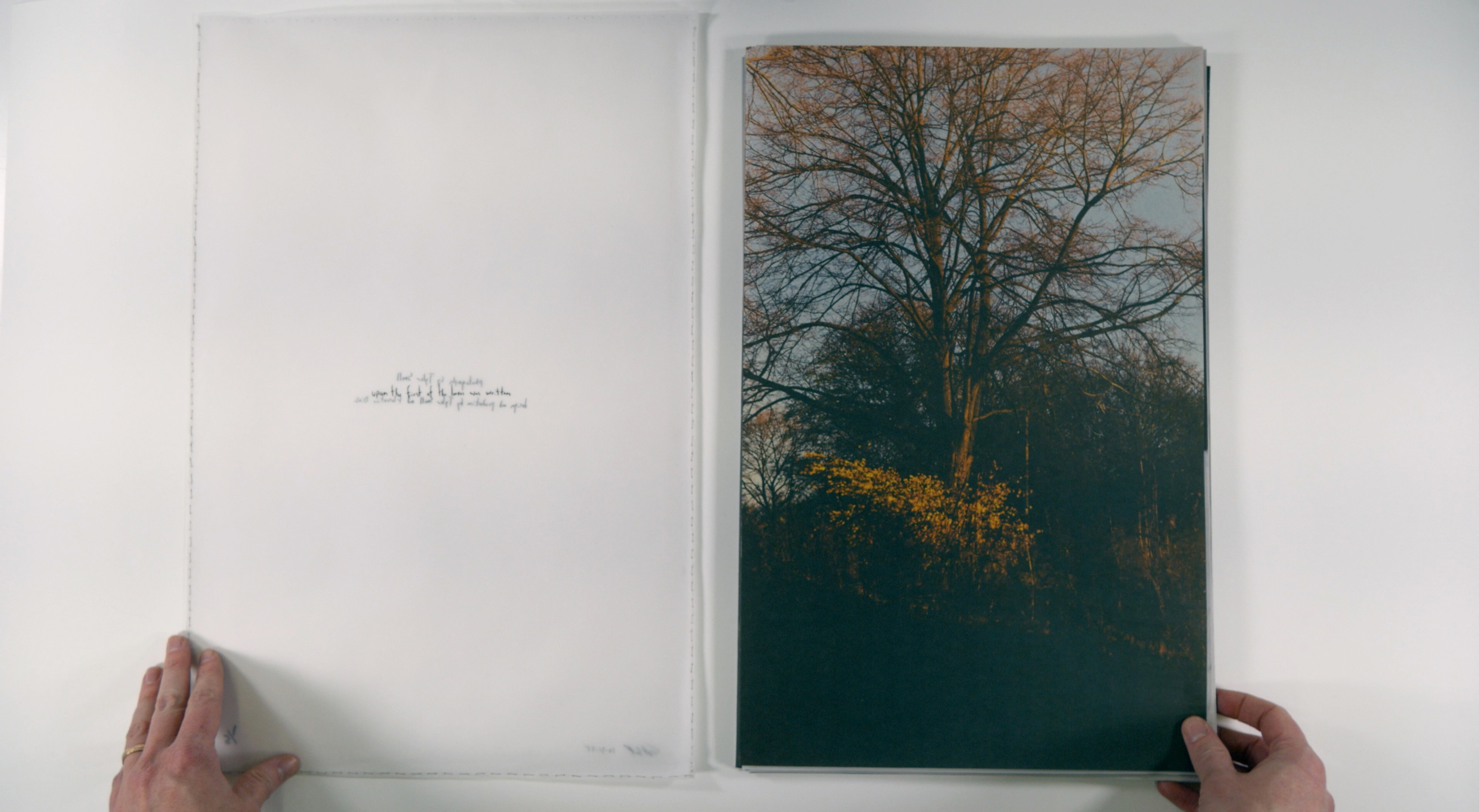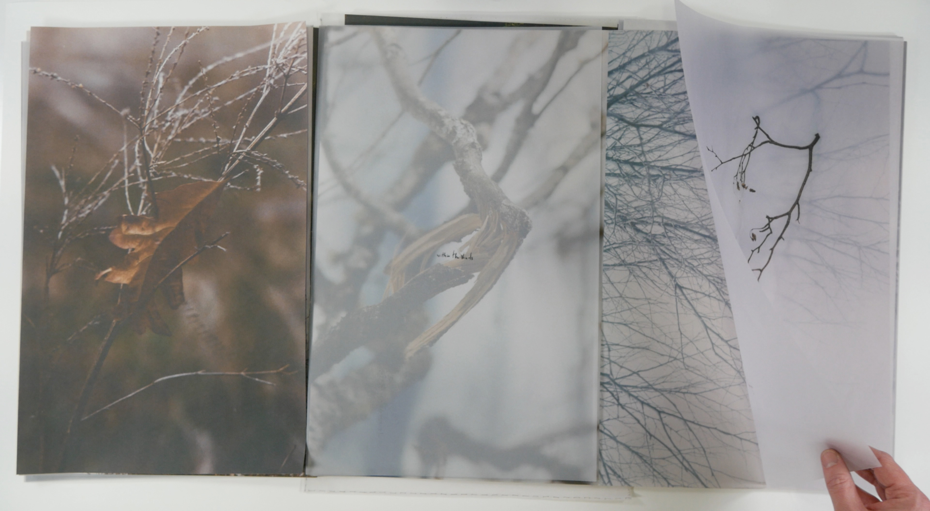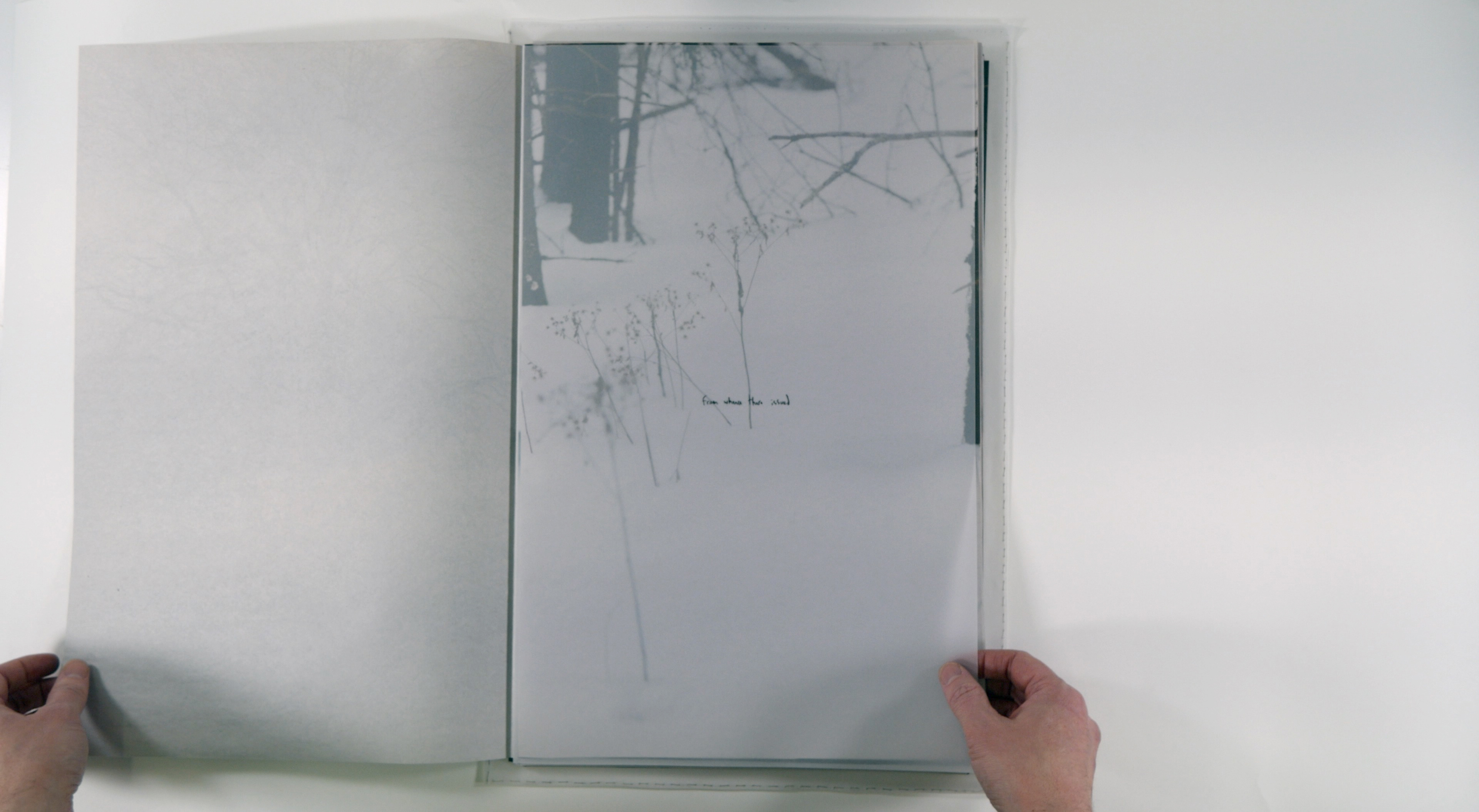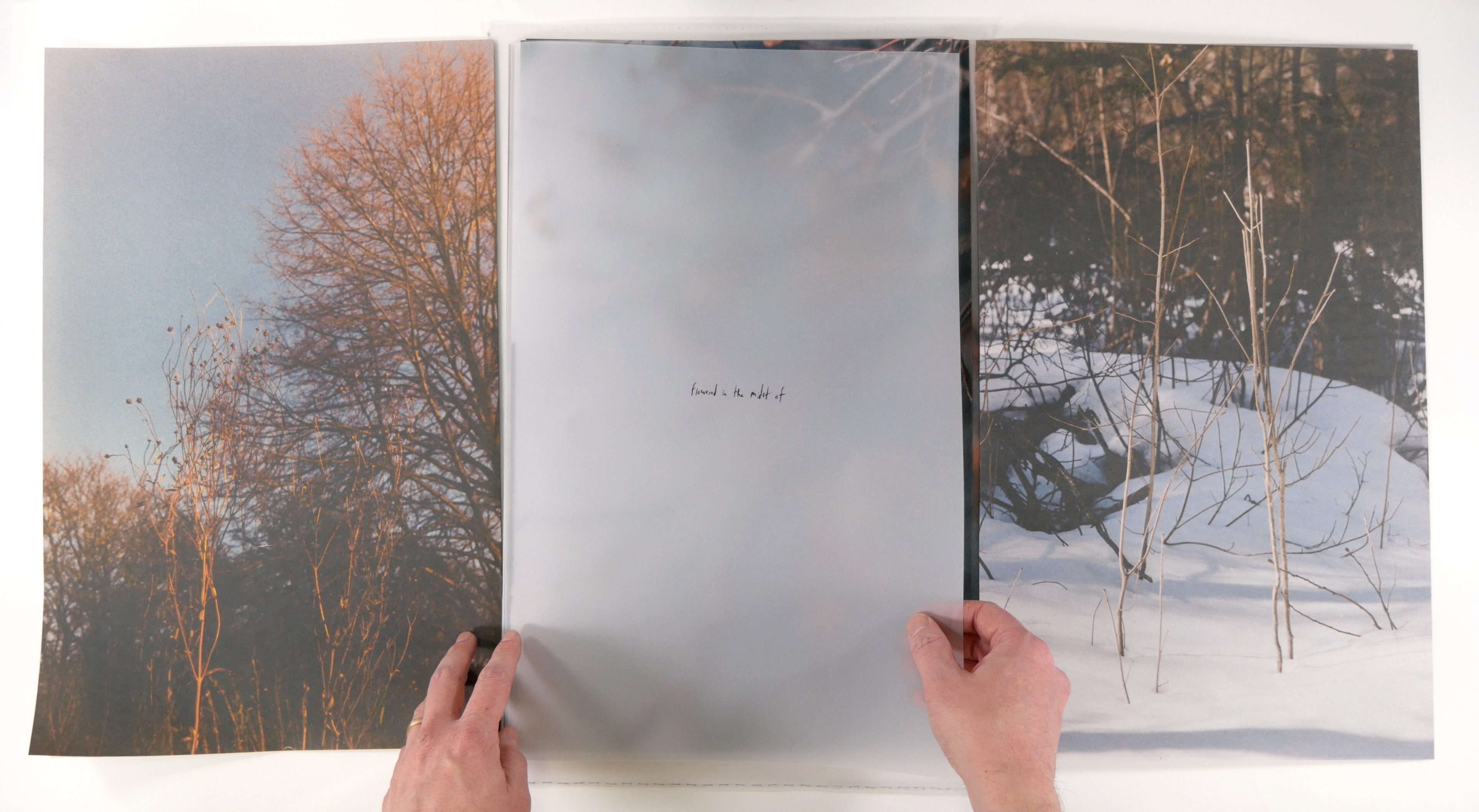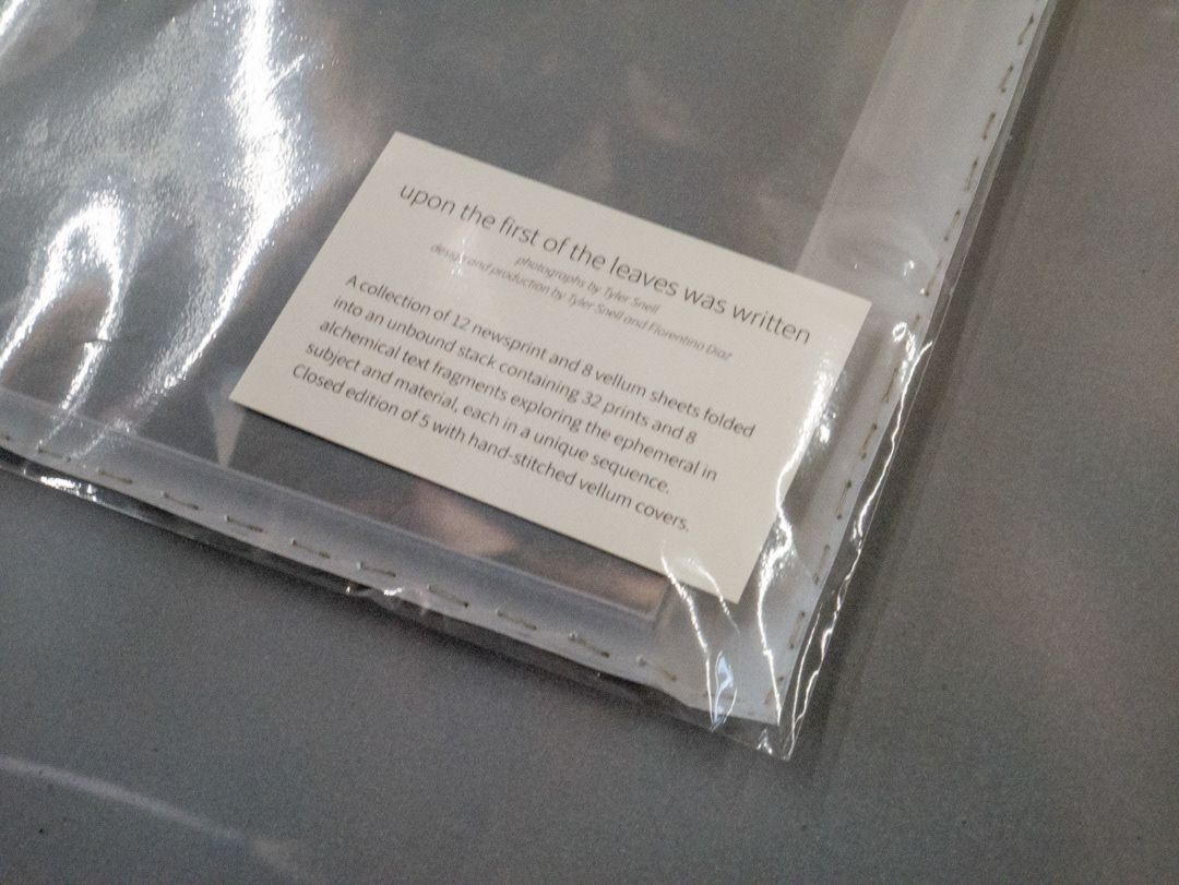 a collection of 12 newsprint and 8 vellum sheets folded into an unbound stack containing 32 approximately 12” x 18” prints and 8 alchemical text fragments exploring the ephemeral in subject and material, each in a unique sequence
